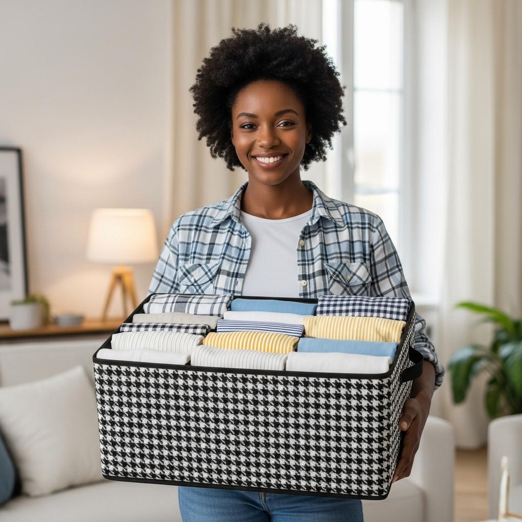 Say goodbye to clutter with our elegant houndstooth storage box – perfect for keeping your clothes neat and your space chic.