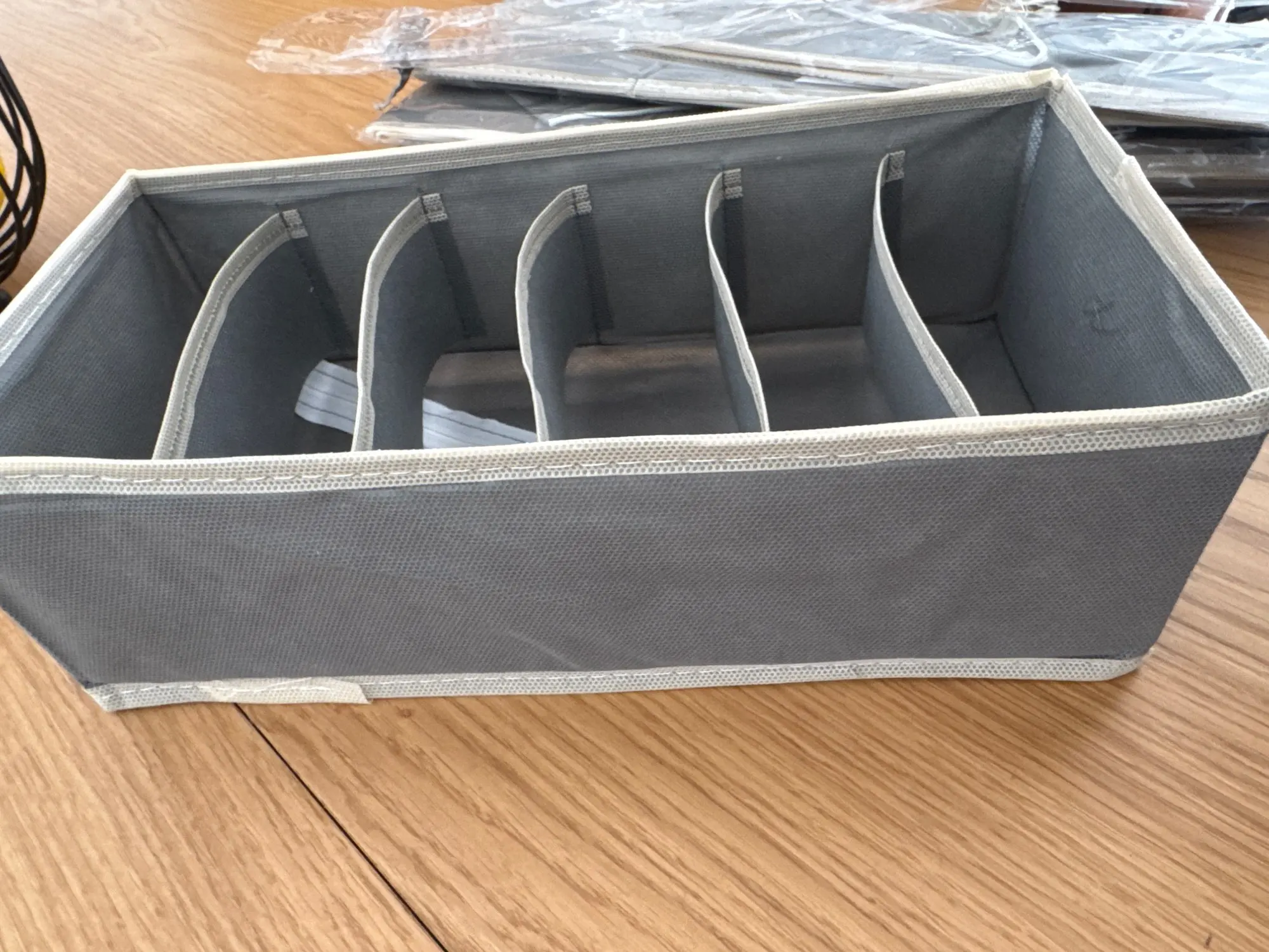 This multifunctional set includes four rectangular bins with various divider layouts, making them the ideal solution for efficiently organizing clothing, underwear, socks, scarves, and other accessories. Each bin offers a capacity of 1-3L, perfectly sized for keeping your smaller items neat and accessible. Their lightweight and foldable nature makes them incredibly easy to store when not in use, providing a versatile and durable solution for all your home storage needs.